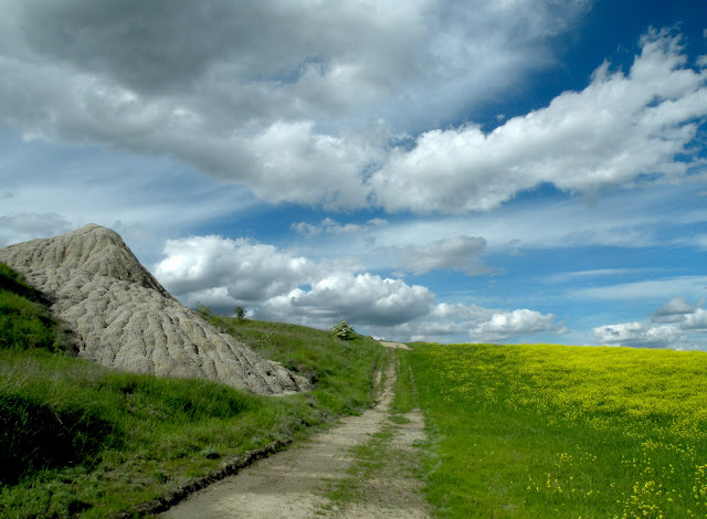 aperta pianura coltivata del Borro Biena alla base degli spettacolari Calanchi